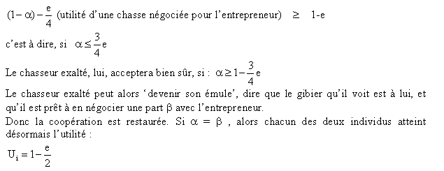 En résumé, il y a 2 chasses en duo et chacune d'entre elle 'rapporte' à i 1/2 (la moitié de l'animal) et lui coûte sa contribution au 'coût de production' e, soit e/4 , et lui rapporte pra ailleurs une joyeuse exaltation j.e.