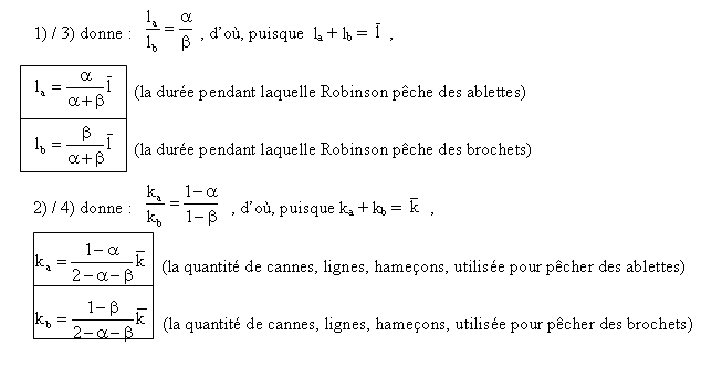 Pour illustrer ce résultat, on peut imaginer que chacun des Robinson reçoit 100 noix (x =100), que 1 'aime deux fois plus' se chauffer que se nourrir (v = 1 ; w = 2), et que 2 aime 'autant' se chauffer et se nourrir (y = z = 1).